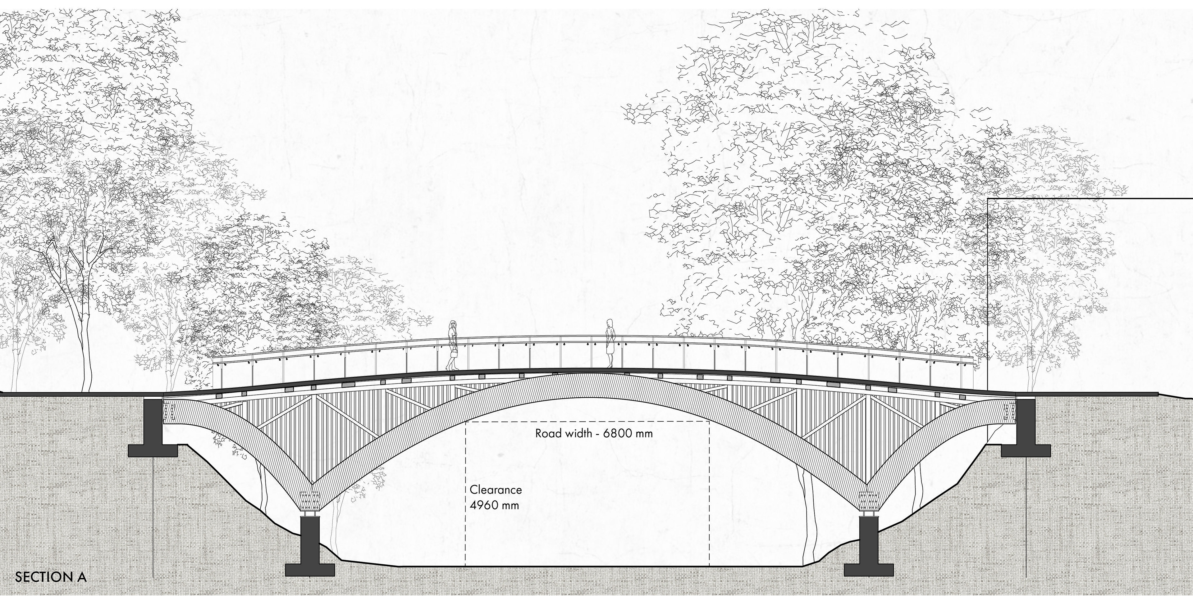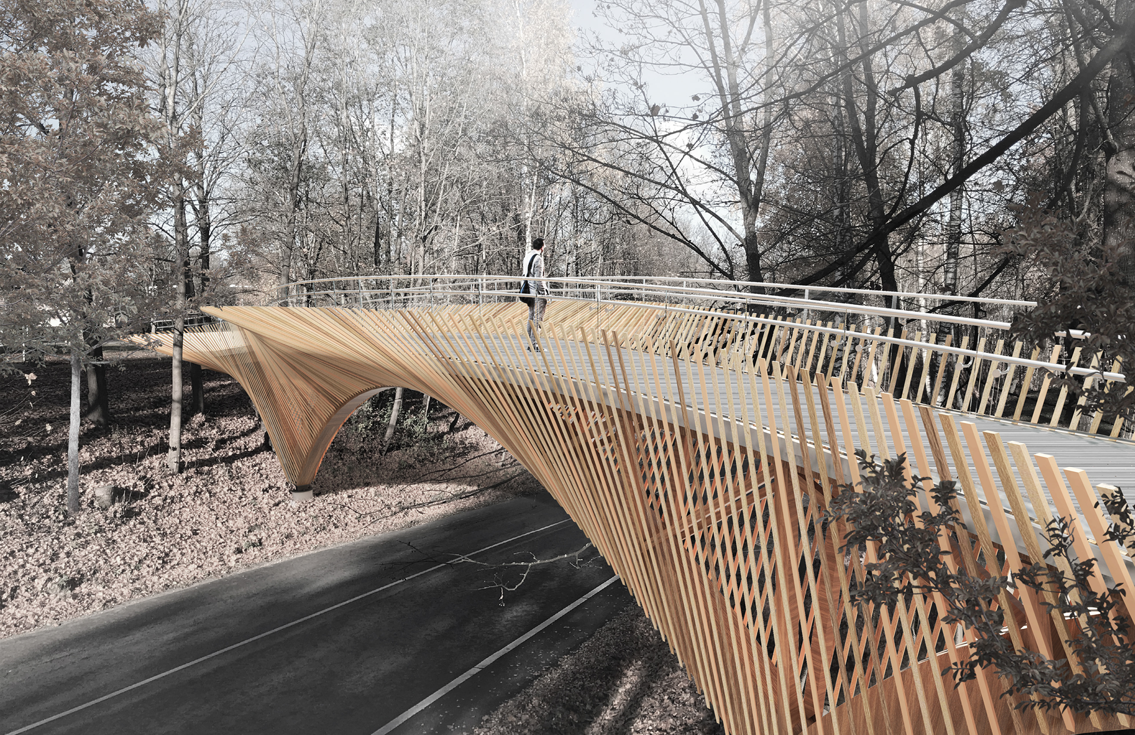 Gauja National Park possess an amalgamation of pristine landscapes and sublime historic architecture. Dense forests, contemplative nature trails, and age-old castles live within the park. Utilizing the arch, this bridge combines its historic meaning and engineering with the contextual significance of the landscape. The footbridge, inspired by the tree branch, reaches over the road and unrolls itself into the adjacent forest. It is a light, wooden gateway that invites visitors to explore the sublime natural world within it.